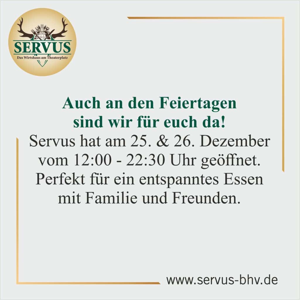 Willkommen im Servus in Bremerhaven, dem Schauplatz der Münchner Gemütlichkeit! Genießen Sie im Servus bayerische Schmankerl, frische Löwenbräu-Biere und unsere außergewöhnliche Gastfreundschaft. Entdecken Sie ein Stück Münchner Wirtshauskultur!